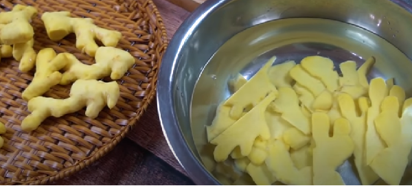Bước 2: Rửa sạch gừng đã cạo vỏ, thái thành từng lát mỏng (không thái mỏng quá, cũng không thái dày quá). Thái gừng đến đâu cho vào âu nước có vắt một xíu nước cốt chanh, ngâm để gừng được trắng đẹp.