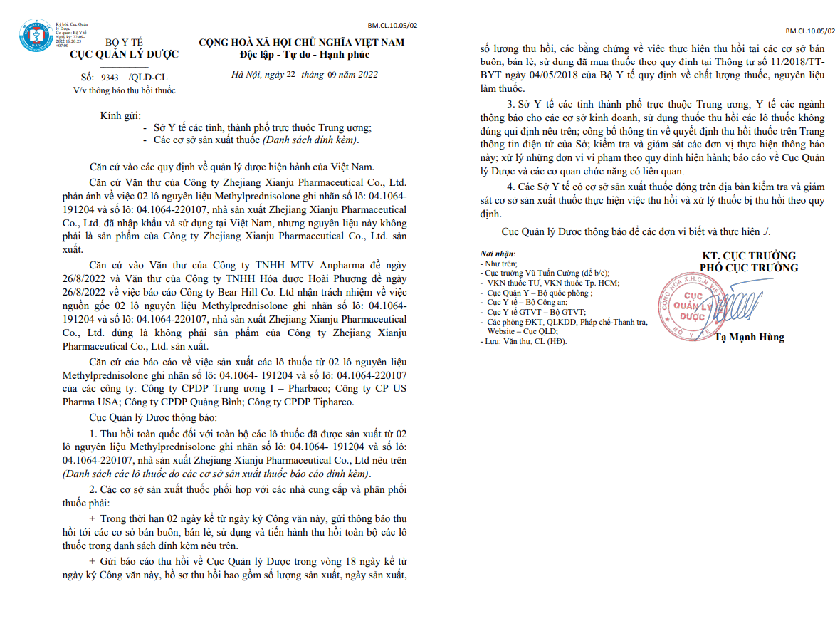 Theo đó, Cục Quản lý Dược thông báo thu hồi toàn quốc đối với toàn bộ các lô thuốc đã được sản xuất từ 2 lô nguyên liệu Methylprednisolone ghi nhãn số lô: 04.1064-191204 và số lô: 04.1064-220107, nhà sản xuất Zhejiang Xianju Pharmaceutical Co., Ltd.