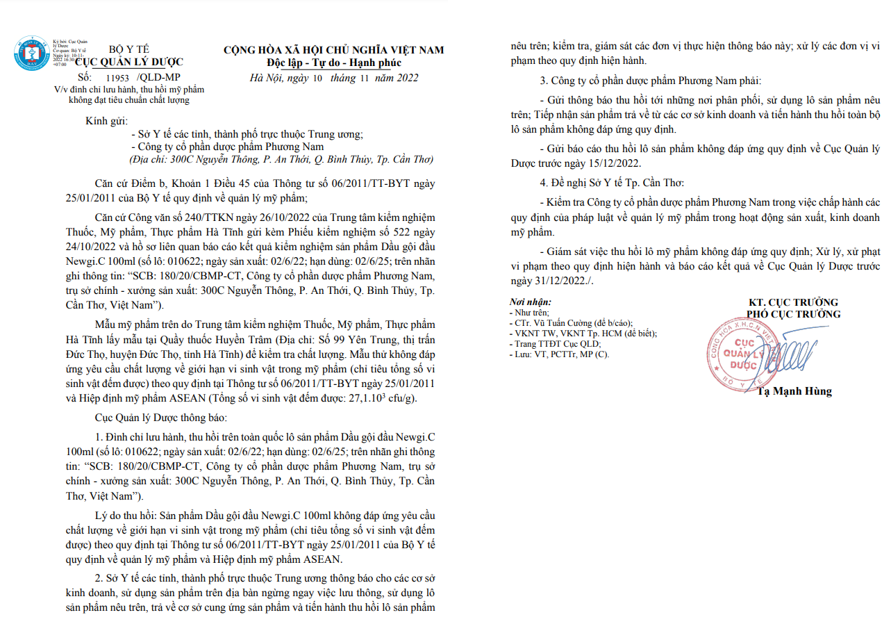 Ngày 26/10/2022, Cục Quản lý Dược (Bộ Y tế) nhận được Công văn số 240/TTKN của Trung tâm kiểm nghiệm Thuốc, Mỹ phẩm, Thực phẩm Hà Tĩnh gửi kèm Phiếu kiểm nghiệm số 522 ngày 24/10/2022 và hồ sơ liên quan báo cáo kết quả kiểm nghiệm sản phẩm Dầu gội đầu Newgi.C 100ml (số lô: 010622; ngày sản xuất: 02/6/22; hạn dùng: 02/6/25; trên nhãn ghi thông tin: “SCB: 180/20/CBMP-CT, Công ty cổ phần dược phẩm Phương Nam, trụ sở chính - xưởng sản xuất: 300C Nguyễn Thông, P. An Thới, Q. Bình Thủy, Tp. Cần Thơ, Việt Nam”).