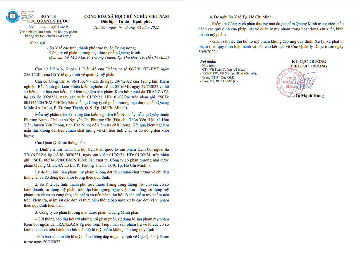 Đối với Công ty Cổ phần Thương mại dược phẩm Quang Minh, Cục Quản lý Dược yêu cầu gửi thông báo thu hồi tới những nơi phân phối, sử dụng lô sản phẩm mỹ phẩm kem bôi ngoài da Tranzaza 8g nêu trên.