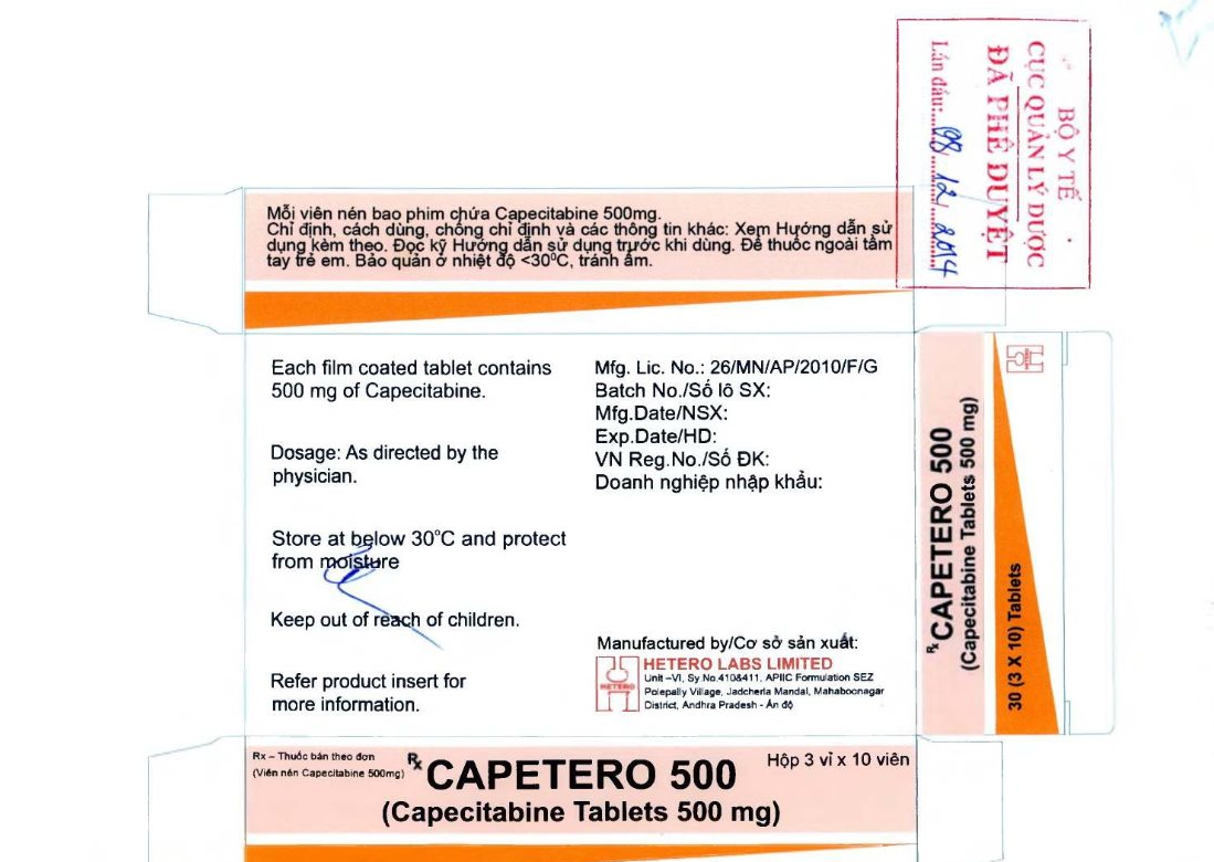 Cục Quản lý Dược xác định lô thuốc viên nén bao phim Capetero 500 (Capecitabine 500mg), Số GĐKLH: VN2-305-14, Số lô: CAH221625B; Số lô: CAH221626B là vi phạm mức độ 2.