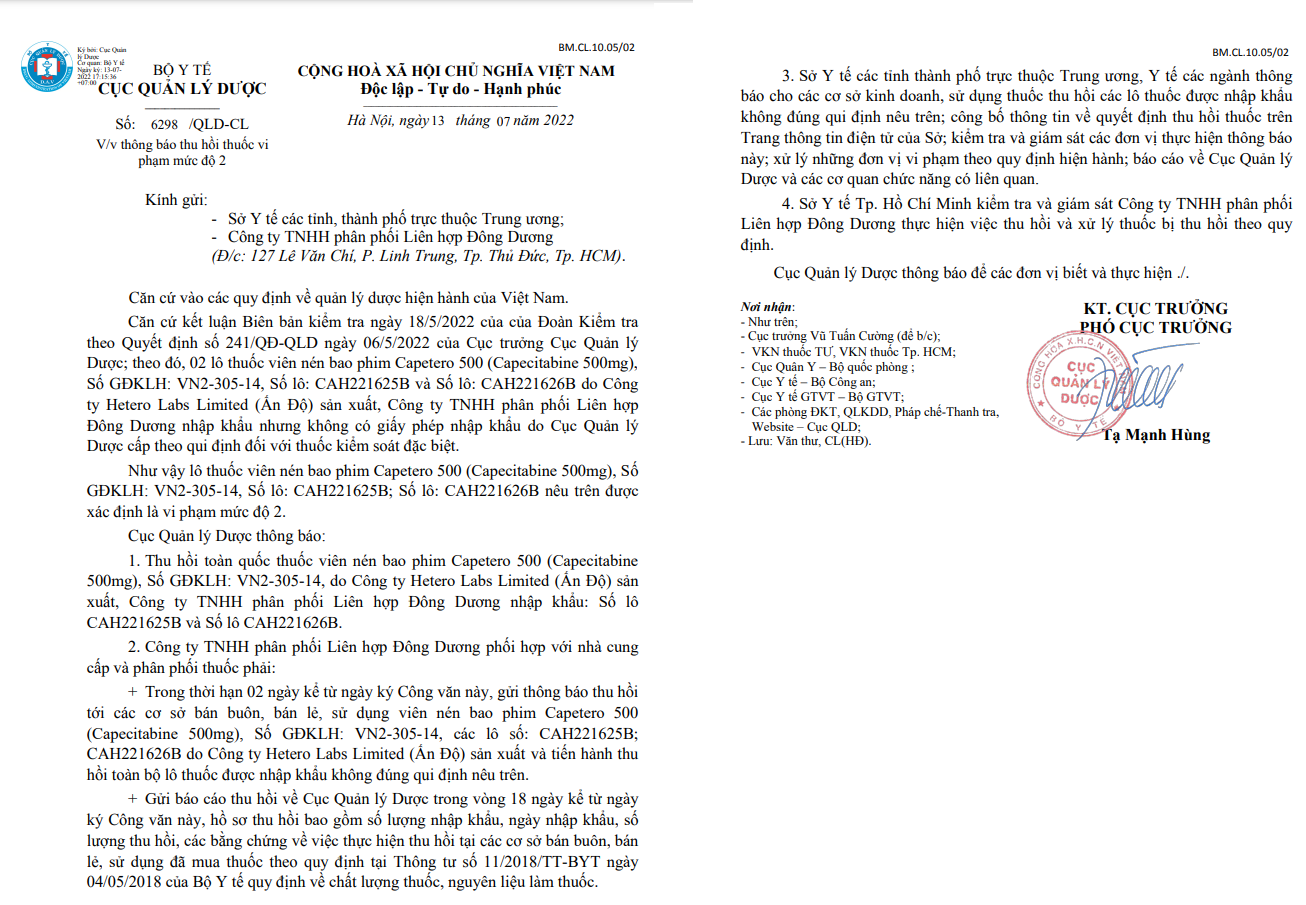 Theo đó, tại kết luận Biên bản kiểm tra ngày 18/5/2022 của của Đoàn Kiểm tra theo Quyết định số 241/QĐ-QLD ngày 6/5/2022; theo đó 02 lô thuốc viên nén bao phim Capetero 500 (Capecitabine 500mg), Số GĐKLH: VN2-305-14, Số lô: CAH221625B và Số lô: CAH221626B do Công ty Hetero Labs Limited (Ấn Độ) sản xuất, Công ty TNHH phân phối Liên hợp Đông Dương (Đ/c: 127 Lê Văn Chí, P. Linh Trung, TP.Thủ Đức, TP.HCM) nhập khẩu nhưng không có giấy phép nhập khẩu do Cục Quản lý Dược cấp theo quy định đối với thuốc kiểm soát đặc biệt.