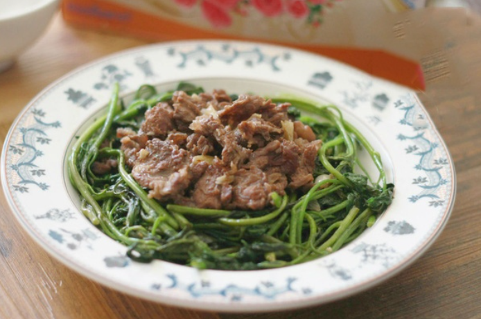 Rau khoai lang xào thịt bò
