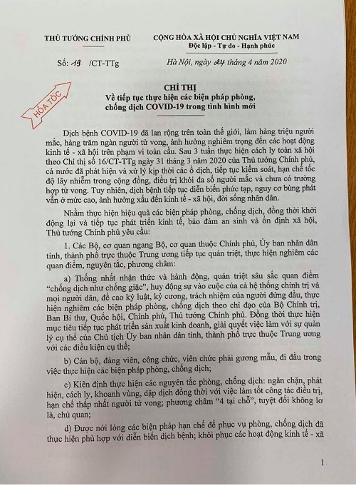 TH&SP Chỉ thị 19/CT-TTg về phòng, chống dịch COVID-19 vừa mới được ban hành nêu rõ được nới lỏng các biện pháp hạn chế để phục vụ phòng, chống dịch đã thực hiện phù hợp với diễn biến dịch bệnh; khôi phục các hoạt động kinh tế-xã hội trên cơ sở bảo đảm kiểm soát tốt dịch bệnh, nhất là tại thành phố Hà Nội, Thành phố Hồ Chí Minh và các đô thị lớn.