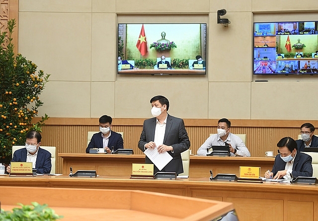 | Bộ trưởng Bộ Y tế Nguyễn Thanh Long báo cáo tình hình dịch bệnh trong cả nước tại cuộc họp chiều ngày 8/2. Ảnh: VGP |