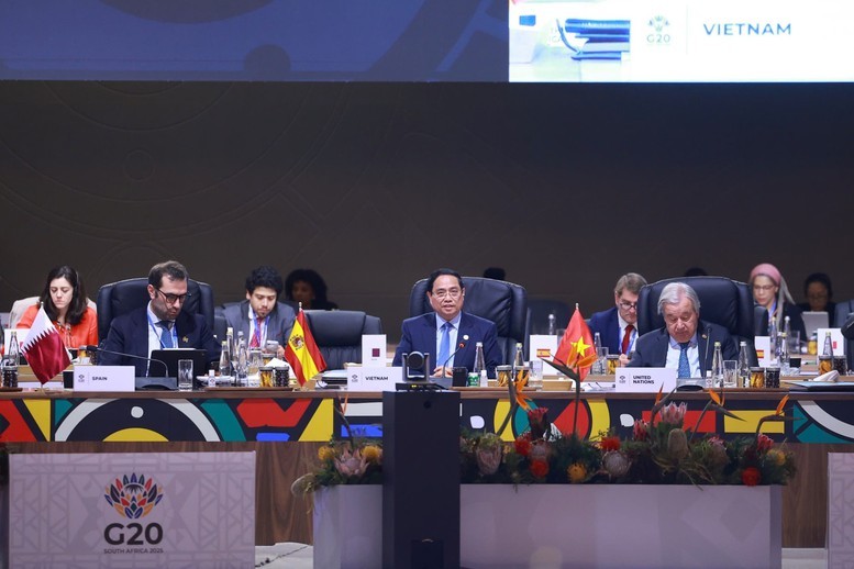 Thứ ba, bảo đảm quản trị toàn cầu linh hoạt, hiệu quả, tạo hệ sinh thái cho phát triển mạnh mẽ trong kỷ nguyên chuyển đổi số, chuyển đổi xanh. Thủ tướng kêu gọi G20 cùng các cơ chế đa phương tăng cường đối thoại, xây dựng khuôn khổ quản trị toàn cầu hài hoà giữa kinh tế, xã hội và môi trường, giữa hiện tại và tương lai, cân bằng lợi ích giữa các nền kinh tế; thúc đẩy hợp tác về trí tuệ nhân tạo, biến đổi khí hậu, phòng chống thiên tai, dịch bệnh…