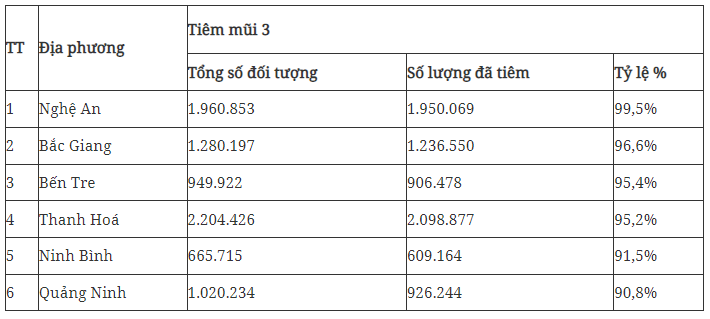 Tuy nhiên, các ý kiến tại phiên họp cũng đánh giá việc tiêm chủng vaccine vẫn chưa đạt mục tiêu đề ra; tốc độ tiêm vaccine COVID-19 ở một số địa phương không đạt tiến độ, nhất là tiêm mũi 3, mũi 4 và tiêm cho trẻ từ 5 đến dưới 12 tuổi. Bên cạnh đó, một số địa phương có tỉ lệ tiêm mũi 3, mũi 4 cho người từ 18 tuổi đạt tỉ lệ cao, như bảng sau: