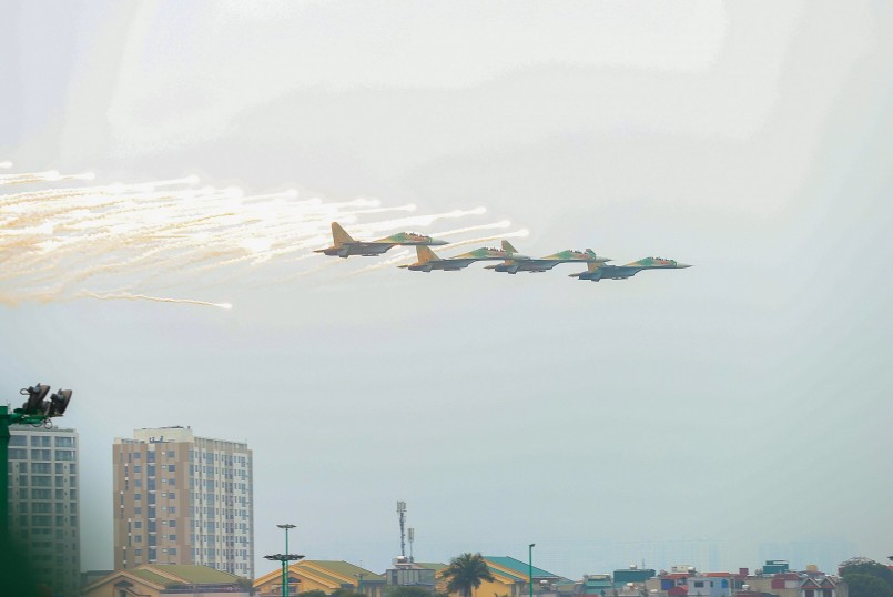 Đặc biệt, Thủ tướng Chính phủ và các đại biểu thưởng lãm màn bay biểu diễn nhào lộn, "khạc lửa" của dàn máy bay chiến đấu Su-30MK2 của Trung đoàn Không quân 927 và dàn trực thăng bay biểu diễn kéo cờ Tổ quốc, cờ triển lãm của Trung đoàn Không quân 916 QĐND Việt Nam.