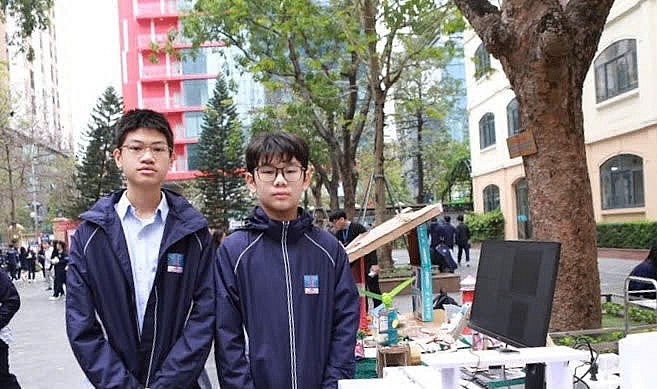 | Nguyễn Thành Vinh và Trần Khải Tuấn - 2 học sinh lớp 8IG1S0, trường Nguyên Siêu tạo ra Hệ thống phân loại rác thông minh sử dụng AI (Ảnh - NCCC) |