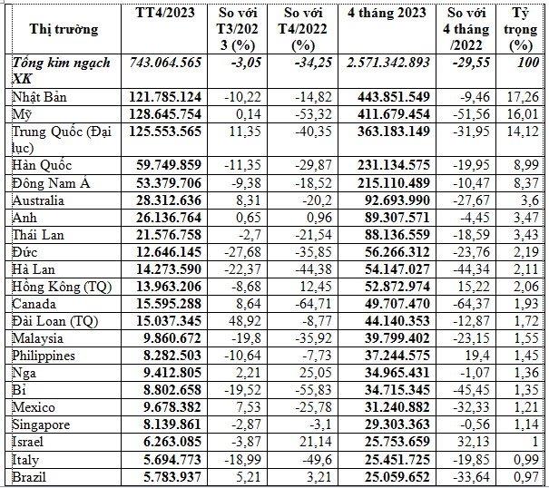 Đứng thứ 2 về kim ngạch là thị trường Mỹ chiếm tỷ trọng 16%, đạt gần 411,68 triệu USD, giảm mạnh 51,6%; riêng tháng 4/2023 xuất khẩu sang thị trường này đạt 128,65 triệu USD, tăng nhẹ 0,1% so với tháng 3/2023 nhưng giảm mạnh 53,3% so với tháng 4/2022.
