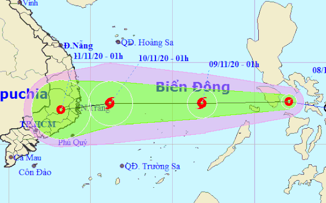 Dự báo trong 24 đến 48 giờ tiếp theo, bão di chuyển theo hướng Tây, mỗi giờ đi được khoảng 20km và có khả năng mạnh thêm. Đến 7 giờ ngày 10/11, vị trí tâm bão ở khoảng 12,4 độ Vĩ Bắc; 110,2 độ Kinh Đông, cách bờ biển các tỉnh từ Phú Yên đến Ninh Thuận khoảng 190km về phía Đông. Sức gió mạnh nhất vùng gần tâm bão mạnh cấp 8-9 (60-90km/giờ), giật cấp 11.