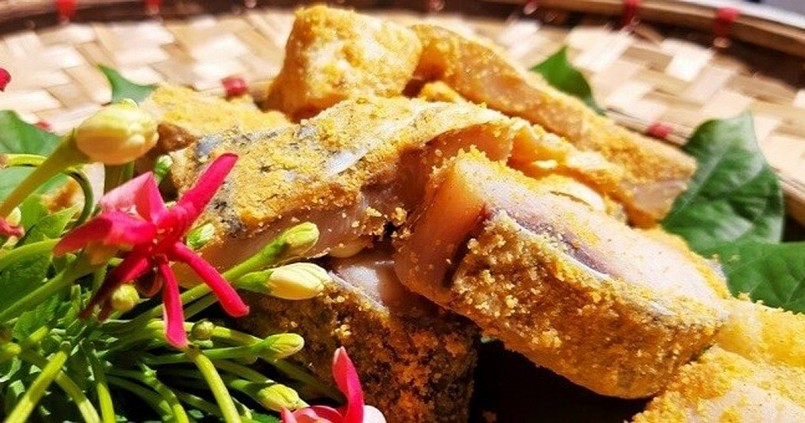 Khi chín, miếng cá màu vàng đều, đôi chỗ sém cạnh, cứng nhưng không khô và mặn như cá mắm biển, cũng không nhão thịt như cá tươi nướng hay rán...