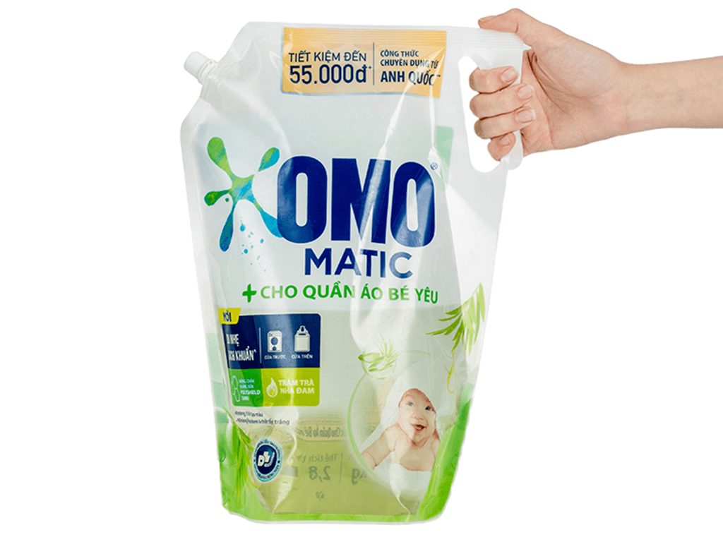 Nước giặt Omo nổi bật với thành phần 3 không: không paraben, không chất tạo màu, không chất tẩy trắng, giúp quần áo mềm mại và không gây hại da.