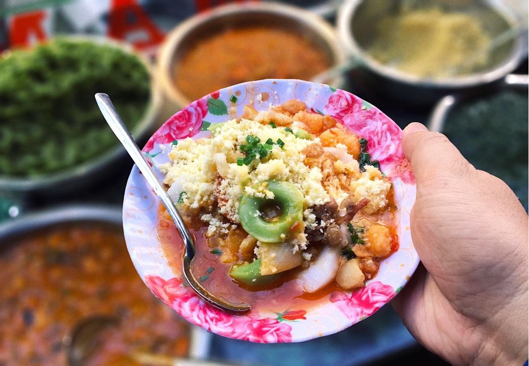 Bánh căn Bình Thuận ăn kèm với đa dạng các loại topping như thịt, chả, trứng, mọc,… Nếu không ăn được trứng bạn cũng có thể dặn bác chủ quán không pha chung nhé.