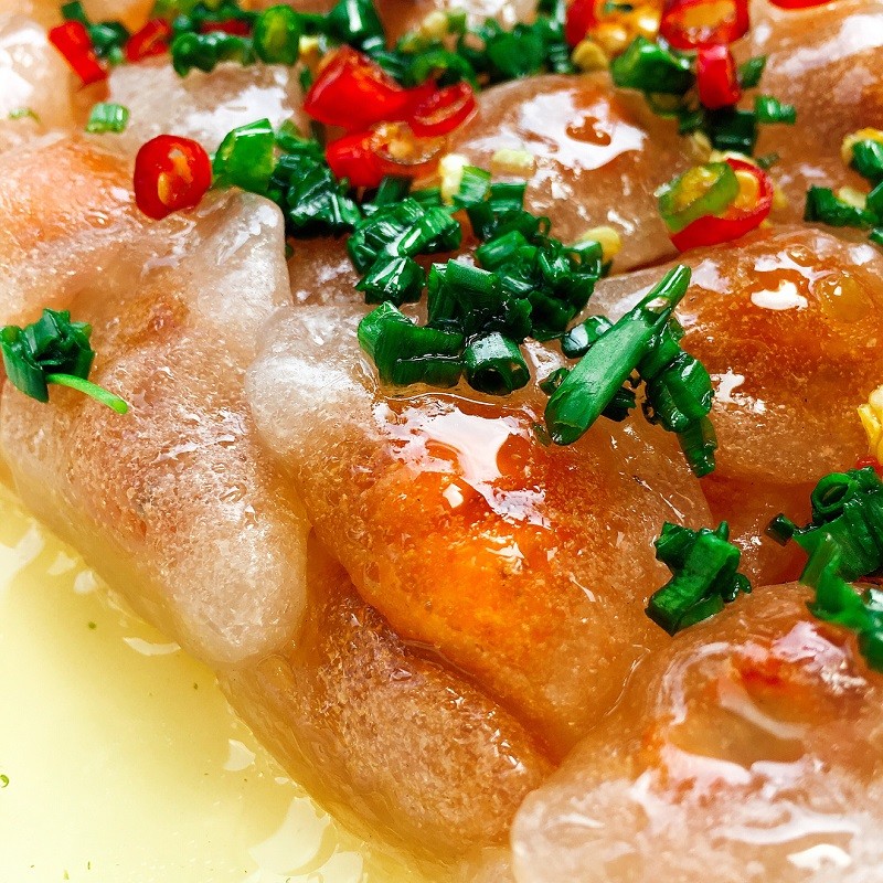 Đặc trưng của món này là lớp bánh trong veo có sự hòa quyện của mỡ thơm ngậy kết hợp cùng những nhân tôm được lột vỏ đỏ au nhìn đầy hấp dẫn và lôi cuốn. Ngoài ra nếu ăn không thì sẽ thấy hơi nhạt nhẽo đôi chút nên chuẩn vị nhất vẫn là các bạn có thể chấm cùng với chén nước mắm Phan Thiết chuẩn hương vị của biển tại đây.