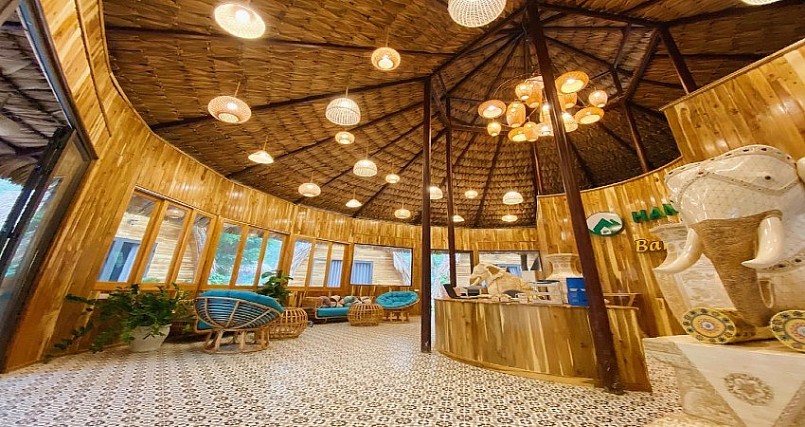 | Thiết kế resort toàn tre, gỗ và lá cọ |