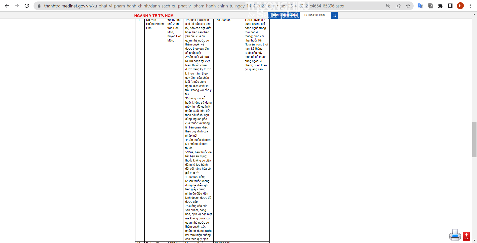 Bán thuốc không đúng địa điểm ghi trên giấy chứng nhận đủ điều kiện kinh doanh dược đã được cấp; Quảng cáo các sản phẩm, hàng hóa, dịch vụ đặc biệt mà không được cơ quan nhà nước có thẩm quyền xác nhận nội dung trước khi thực hiện quảng cáo theo quy định. Với những hành vi vi phạm trên, Nguyễn Hoàng Khánh Linh bị Thanh tra Sở Y tế TP.HCM xử phạt số tiến là 145 triệu đồng.