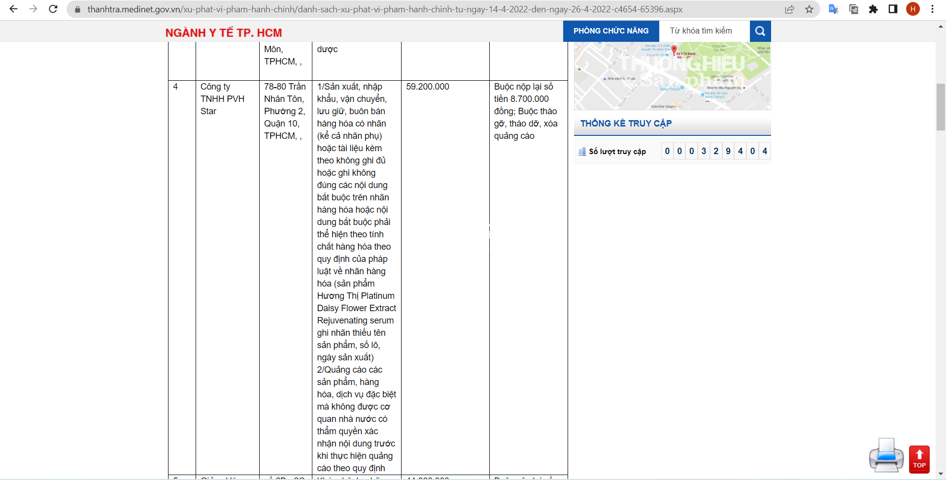 Thanh tra Sở Y tế TP.HCM vừa ban hành quyết định xử phạt đối với Công ty TNHH PVH Star về các hành vi: Kinh doanh mỹ phẩm (sản phẩm Hương Thị Platinum Daisy Flower Extract Rejuvenating serum ghi nhãn thiếu tên sản phẩm, số lô, ngày sản xuất) và quảng cáo sản phẩm mà không được cơ quan nhà nước có thẩm quyền xác nhận nội dung.