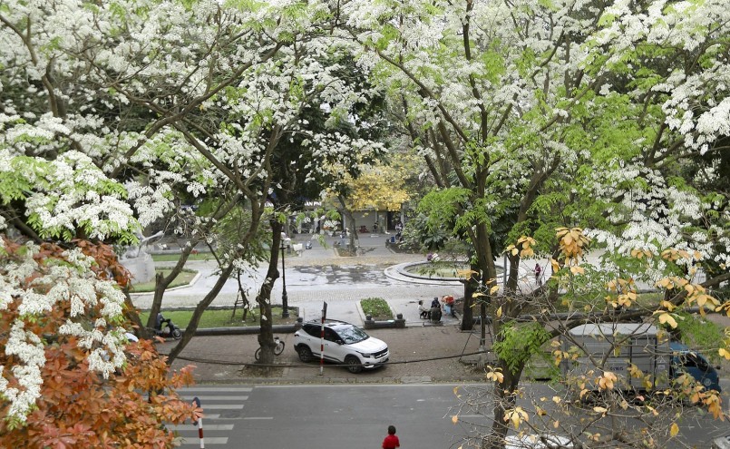 | Hoa sưa bắt đầu nở trắng những góc phố, con ngõ của Hà Nội. |