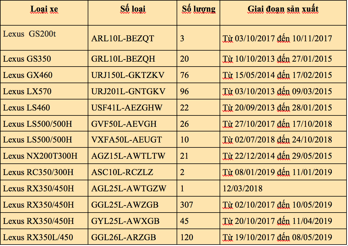 Toyota Việt Nam vừa thông báo triệu hồi 749 xe Lexus do hãng này nhập khẩu và phân phối để thay thế bơm nhiên liệu. Những mẫu xe trong diện ảnh hưởng được sản xuất từ năm 2013 đến năm 2019. Chương trình triệu hồi bắt đầu từ ngày 4/9/2020 và dự kiến kết thúc vào ngày 4/9/2023. Thời gian kiểm tra và thay thế khoảng 1,7 - 4,2h.
