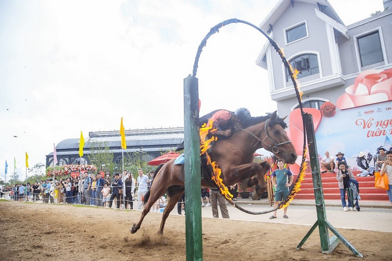 Phần trình diễn được nhiều người mong chờ nhất là điều khiển ngựa nhảy xuyên vòng lửa, khiến khán giả nín thở chờ đợi và không thể rời mắt theo dõi. Cùng với màn chạy đà và cú nhảy vọt mạnh mẽ, những tuấn mã đã xuất sắc đưa người bạn đồng hành của mình trên lưng cùng xuyên qua vòng tròn lửa cháy rực, tạo thành màn trình diễn vô cùng đẹp mắt, khiến khán giả reo hò không ngớt.