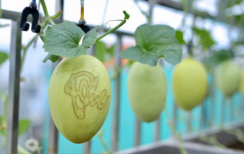 | Vườn dưa lưới trên sân thượng được chăm sóc đặc biệt bằng trứng sữa và mật mía, mỗi quả được khắc chữ thủ công rất độc đáo. |
