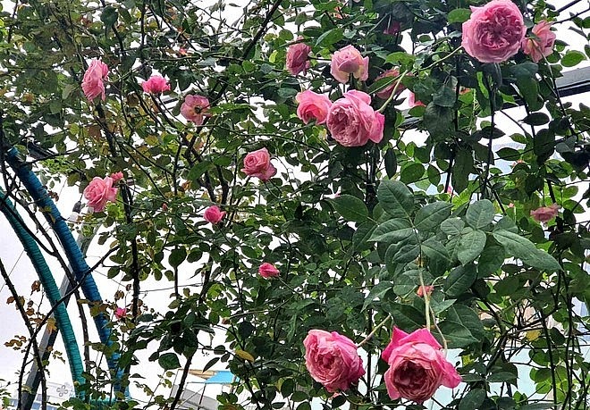 Vườn hồng trên sân thượng vì diện tích hạn chế nên chị phải thiết kế hai vòm cao 3m và hai lớp giàn để giàn trên kéo lưới che nắng vào mùa hạ, giàn dưới tạo điểm bám cho hồng. Vào mùa hồng trổ bông, chồng và các con chị Thu Phương đều biết chị nhớ bố nên dành không gian yên tĩnh để chị chăm sóc, hãm mầm cho hoa nở đúng dịp tết và duy trì những cây hoa đang độ nở./.