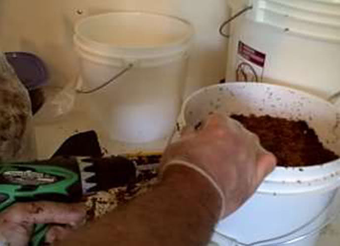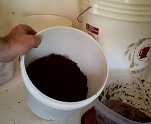 Bước 2: Sau đó, bạn đổ bã cà phê vào khoảng nửa thùng nhựa hoặc xô. Bạn kiểm tra nếu bã cà phê bị khô thì cho thêm ít nước vào cho đủ độ ẩm. Chú ý không nên cho quá nhiều nước để tránh tình trạng ứ đọng.