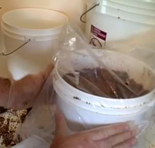 Bước 5: Bạn che xô lại bằng túi nhựa trong suốt và không quên đục một vài lỗ thủng để khí thoát ra. Khi nấm bắt đầu phát triển, bạn có thể bỏ túi nhựa ra.