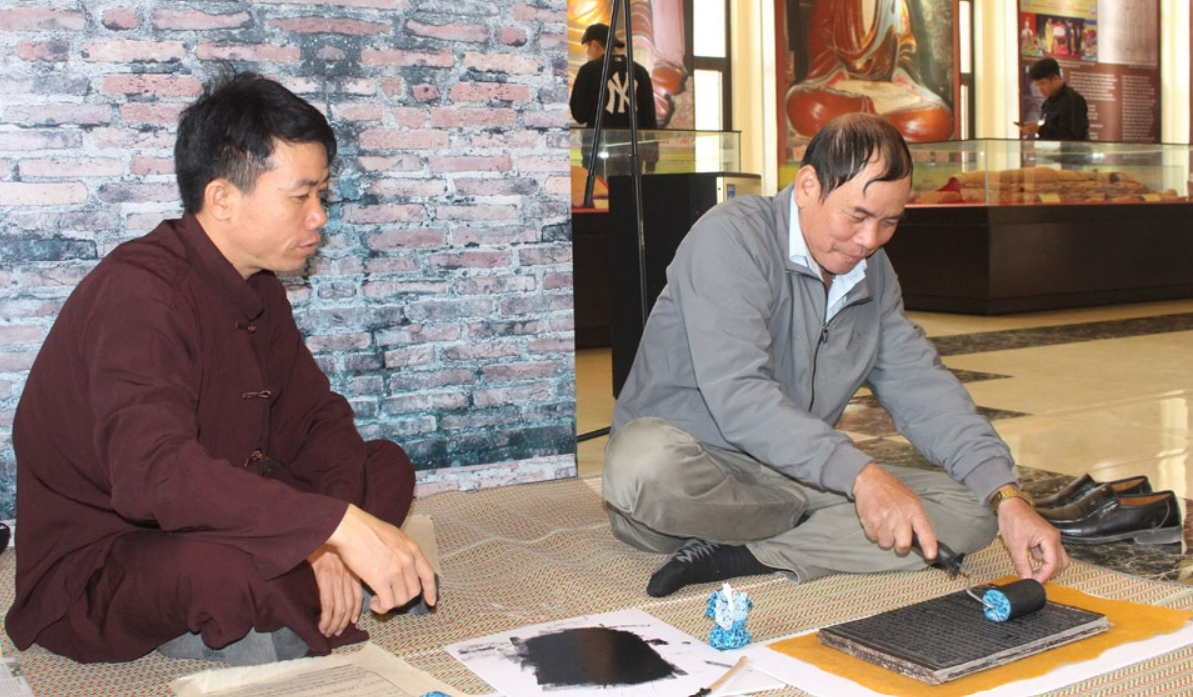 | Du khách trải nghiệm in dập mộc bản. |