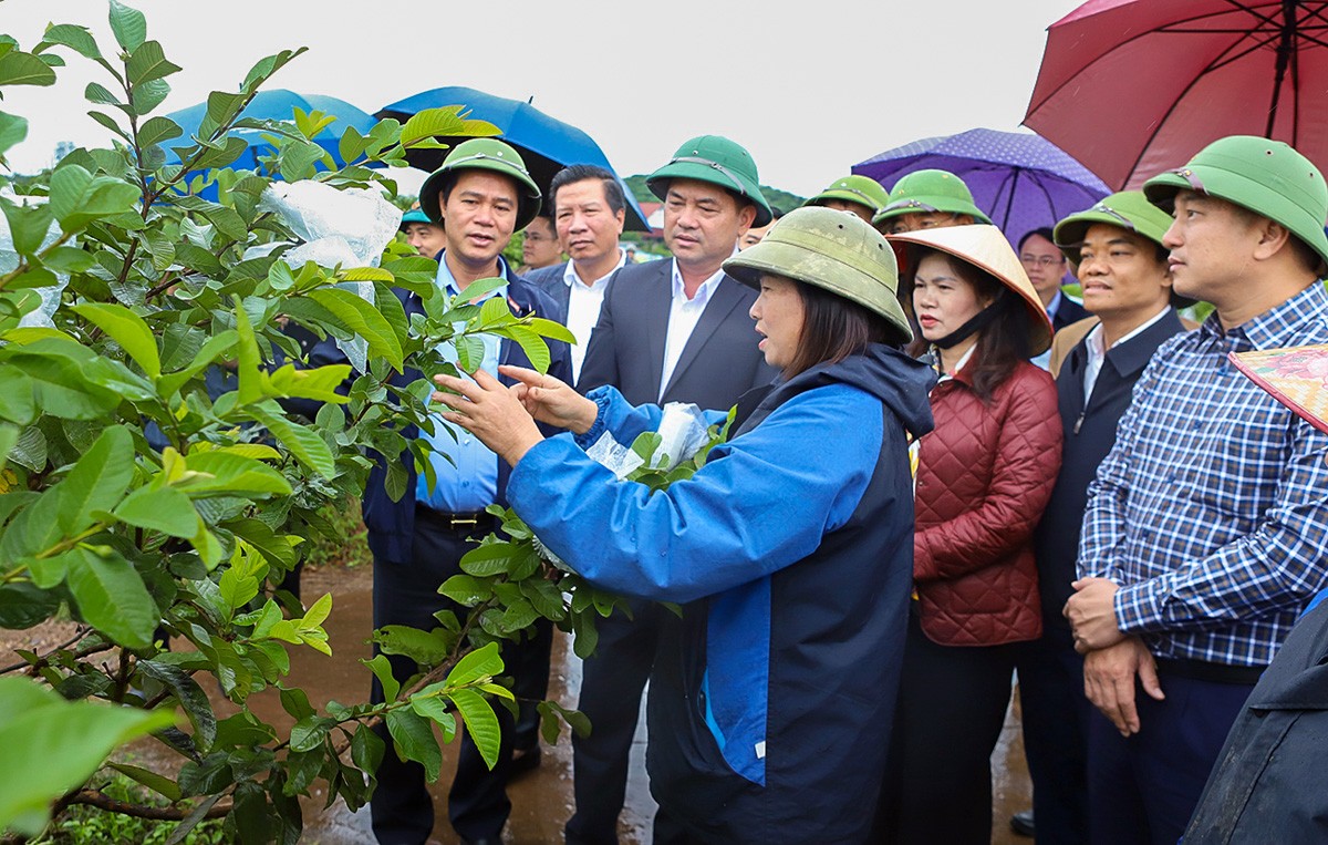 | Bí thư Tỉnh ủy Nguyễn Hồng Thái và các đồng chí lãnh đạo tỉnh kiểm tra vùng sản xuất ổi của nông dân xã Phúc Hòa. |