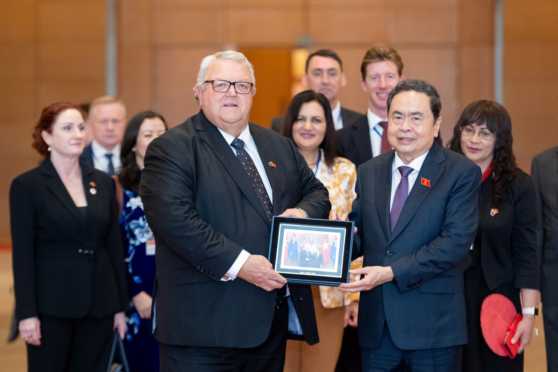 | Chủ tịch Quốc hội Trần Thanh Mẫn tặng quà lưu niệm Chủ tịch Quốc hội New Zealand Gerry Brownlee. |