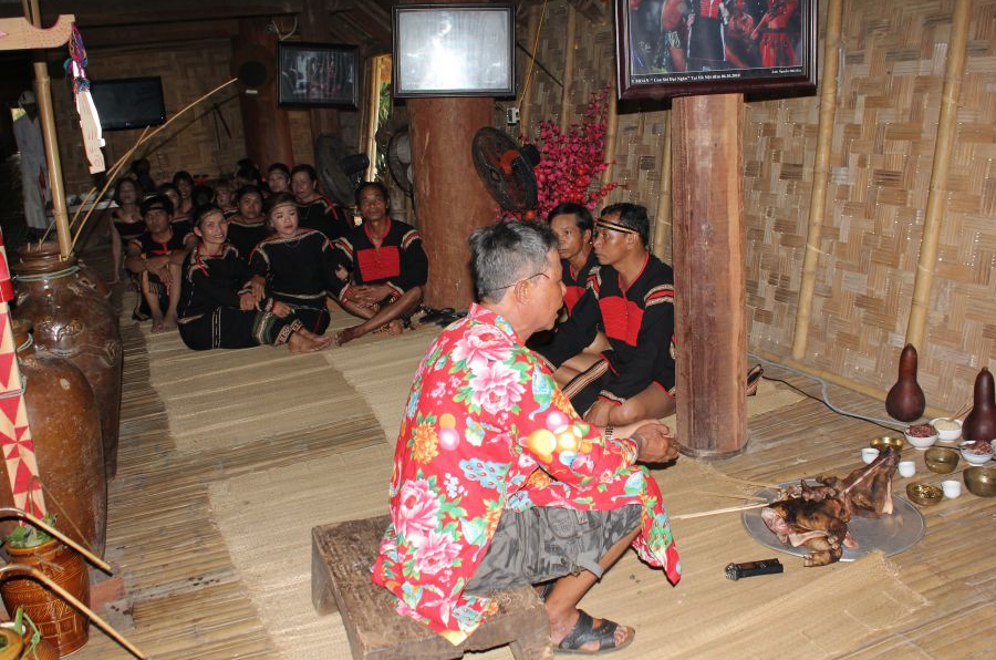 | Lễ kết nghĩa anh em được thực hiện bởi Già làng, thầy cúng và người tham gia nghi lễ. |