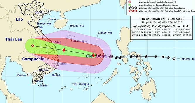 Với tốc độ di chuyển rất nhanh, vào sáng sớm mai, 28/10, bão số 9 sẽ ở khu vực bờ biển các tỉnh Đà Nẵng đến Phú Yên, sức gió mạnh nhất ở gần tâm bão đạt cấp 14, giật cấp 17, bão số 9 sẽ đổ bộ vào đất liền các tỉnh này.