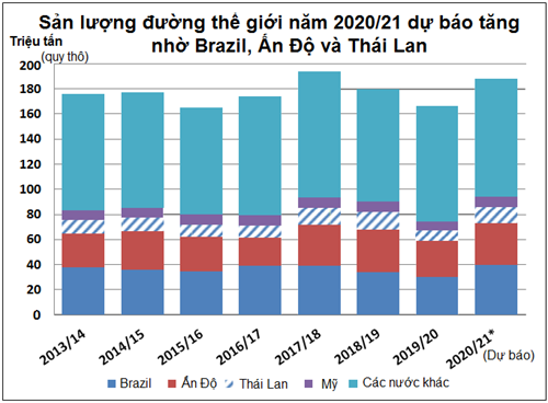 USDA cũng đã đưa ra những dự báo đầu tiên về niên vụ 2020/21, theo đó sản lượng đường toàn cầu dự báo tăng 22 triệu tấn lên 188 triệu tấn (quy thô), do sản lượng của Brazil, Ấn Độ và Thái Lan tăng. Tiêu thụ dự báo cũng sẽ tăng lên kỷ lục cao nhờ xu hướng gia tăng tiêu thụ ở các thị trường như Ấn Độ, và dự báo tồn trữ cuối vụ tiếp tục giảm. Xuất khẩu dự báo cũng sẽ tăng mạnh theo xu hướng sản lượng.