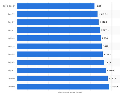 Thống kê và dự báo của trang Statista.com về sản lượng mía thế giới
