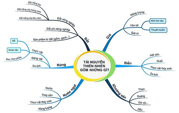 Tài nguyên đất: đất nông nghiệp, đất phi nông nghiệp, đất để sản xuất công nghiệp(như làm gạch, làm gốm…); Tài nguyên rừng: gồm động vật, thực vật, lâm sản, địa điểm du lịch…; Tài nguyên nước ngọt: nước uống, nước sản xuất, thủy sản nước ngọt, các loài thực vật thủy sinh, năng lượng thủy điện…; Tài nguyên gió: sức gió, vận tải…; Tài nguyên biển: hải sản, muối, thực vật thủy sinh, địa điểm du lịch… Tài nguyên khoáng sản: than đá, quặng, đá vôi, dầu khí…