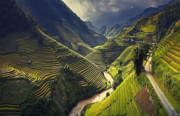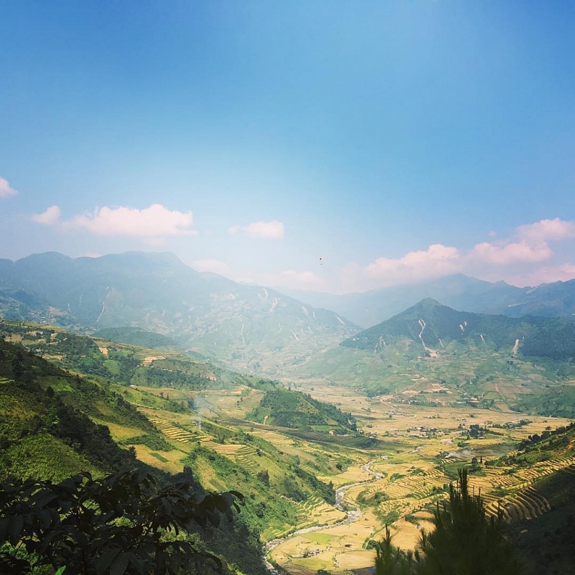 Đứng nhìn từ đèo Khau Phạ, con đường như sợi chỉ mảnh giữa bầu trời. Nổi bật hơn cả là từng lớp lúa tạo nên vô vàn màu sắc tươi đẹp quyến rũ lòng người. Thấp thoáng đâu đó là một vài ngôi nhà nhỏ ở phía xa xa. Tất cả hiện lên như một bức tranh đẹp như trong truyện cổ tích.