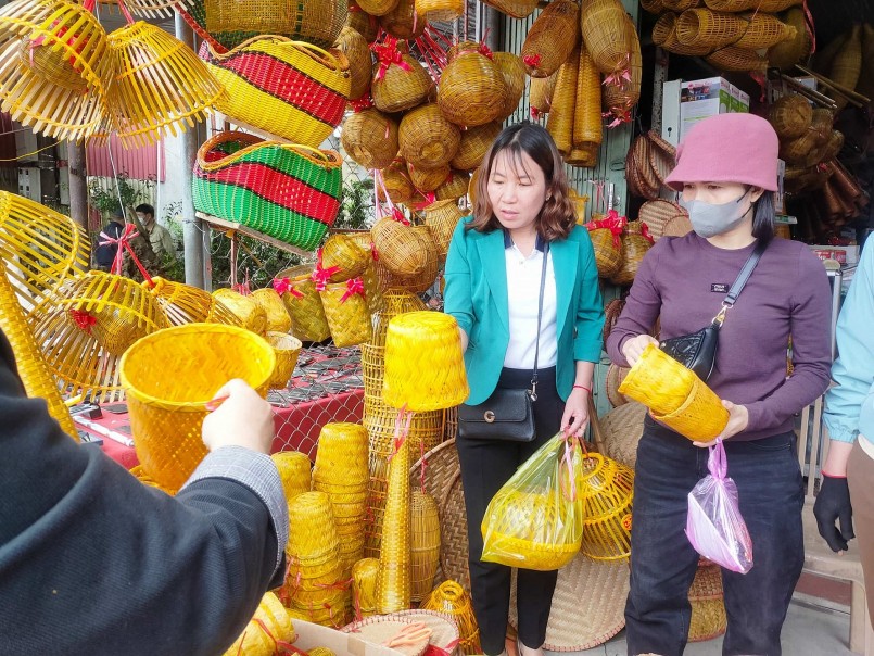 | Du khách chọn mua giỏ đồ, nơm cá với hy vọng tài lộc cho năm mới. |