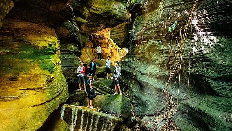 Nơi này chẳng khác chốn tiên cảnh là bao, tiếng suối chảy róc rách, vách đá phủ đầy rêu phong cùng dây leo và những khối thạch nhũ lấp lánh tạo nên bầu không khí vô cùng thanh bình.