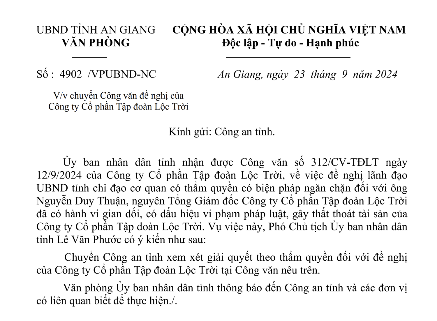 UBND tỉnh An Giang cho biết vừa nhận được công văn của CTCP Tập đoàn Lộc Trời (LTG) về việc đề nghị lãnh đạo UBND tỉnh chỉ đạo cơ quan có thẩm quyền có biện pháp ngăn chặn đối với ông Nguyễn Duy Thuận, nguyên tổng giám đốc vì đã có hành vi gian dối, có dấu hiệu vi phạm pháp luật, gây thất thoát tài sản của công ty.