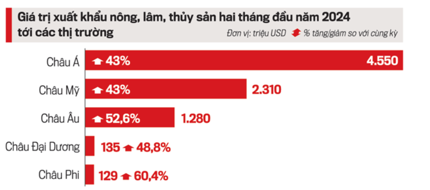 Cũng theo Bộ NN&PTNT, giá trị xuất khẩu nông, lâm, thủy sản hai tháng đầu năm 2024 tới các thị trường đều tăng so với cùng kỳ năm trước. Trong đó, khu vực châu Á đạt 4,55 tỷ USD, tăng 43%; châu Mỹ đạt 2,31 tỷ USD, tăng 74,2%; châu Âu đạt 1,28 tỷ USD, tăng 52,6%; châu Đại Dương đạt 135 triệu USD, tăng 48,8%; châu Phi đạt 129 triệu USD, tăng 60,4%.