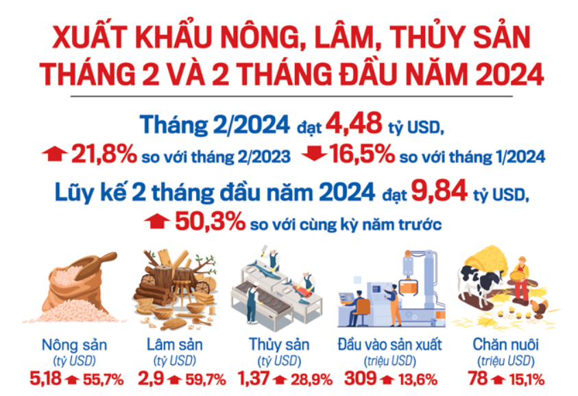 Theo số liệu từ Bộ Nông nghiệp và Phát triển nông thôn (NN&PTNT), kim ngạch xuất khẩu nông, lâm, thủy sản trong tháng 2/2024 đạt 4,48 tỷ USD, tăng 21,8% so với tháng 2/2023, nhưng giảm 16,5% so với tháng 1/2024. Tính chung hai tháng đầu năm 2024, tổng kim ngạch xuất khẩu của toàn ngành đạt 9,84 tỷ USD, tăng 50,3% so với cùng kỳ năm trước. Toàn ngành nông, lâm, ngư nghiệp xuất siêu 2,68 tỷ USD, tăng gần 2,9 lần so với hai tháng đầu năm 2023.