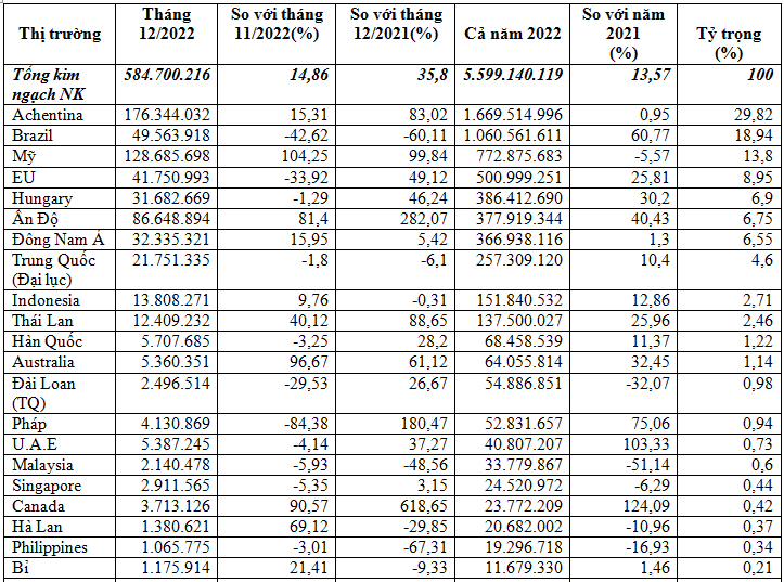 Đứng thứ 2 là thị trường Brazil chiếm tỷ trọng 18,9%, đạt trên 1,06 tỷ USD, tăng 60,8% so với năm 2021; riêng tháng 12/2022 nhập khẩu từ thị trường này đạt 49,56 triệu USD, tiếp tục giảm 42,6% so với tháng 11/2022 và giảm mạnh 60% so với tháng 12/2021.