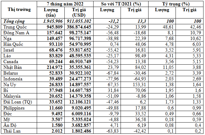 Ngược lại, nhập khẩu từ thị trường Nga tiếp tục giảm mạnh, giảm 74,7% về lượng và giảm 76% kim ngạch so với tháng 6/2022, đạt 2.592 tấn, tương đương 2,01 triệu USD; so với tháng 7/2021 cũng giảm mạnh 94,9% về lượng, giảm 88% kim ngạch.