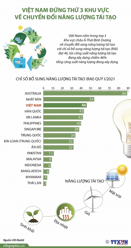 Trang energyvoice.com dẫn kết quả nghiên cứu mới nhất của IHS Markit (Anh) cho thấy Việt Nam nằm trong top 3 khu vực châu Á-Thái Bình Dương về chuyển đổi sang năng lượng tái tạo đạt 46, tức công suất năng lượng tái tạo đang xây dựng chiếm 46% tổng công suất năng lượng đang xây dựng.