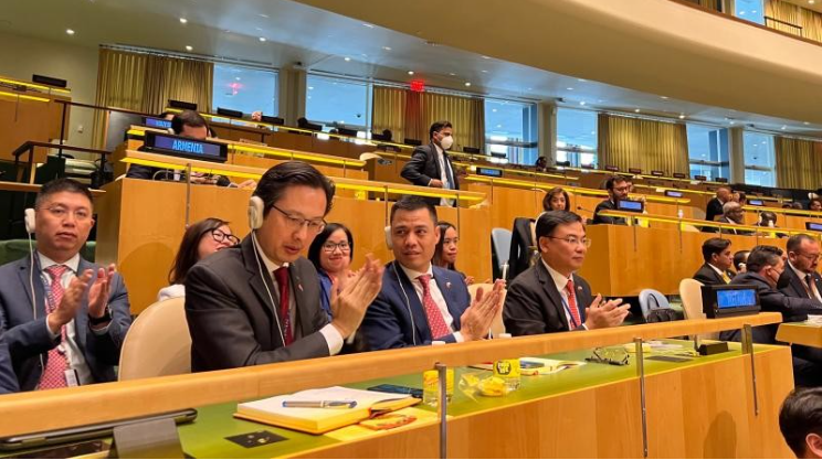 | Đoàn Việt Nam tham dự phiên họp bỏ phiếu và công bố kết quả thành viên Hội đồng Nhân quyền Liên Hợp Quốc nhiệm kỳ 2023-2025. Ảnh: Phái đoàn Việt Nam tại Liên Hợp Quốc |