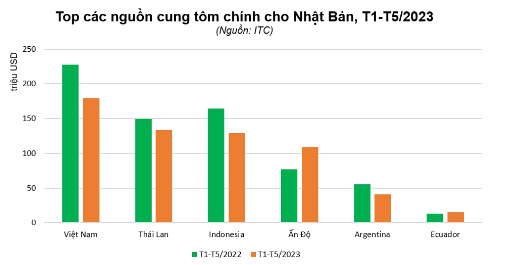 Việt Nam vẫn là nguồn cung tôm lớn nhất cho Nhật Bản, chiếm thị phần 23,7%. Thái Lan đứng thứ 2 với thị phần 17,7%. Tiếp đó, Ấn Độ đứng thứ 4 với 14,5% và Ecuador xếp thứ 10 với 2,1%.