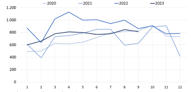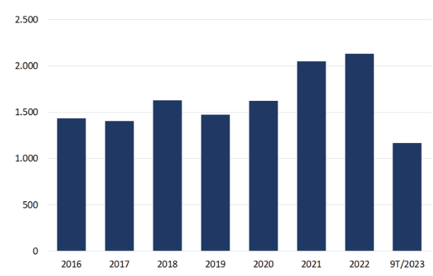| Kim ngạch xuất khẩu thủy sản sang Mỹ từ 2016 đến 9T/2023 (triệu USD) |