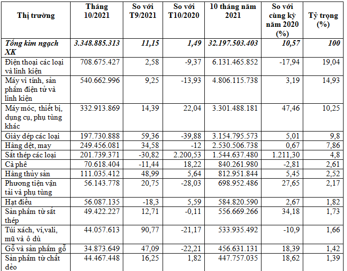 Trong đó, riêng tháng 10/2021 đạt gần 3,35 tỷ USD, tăng 11,2% so với tháng liền kề trước đó và tăng 1,5% so với tháng 10/2020.